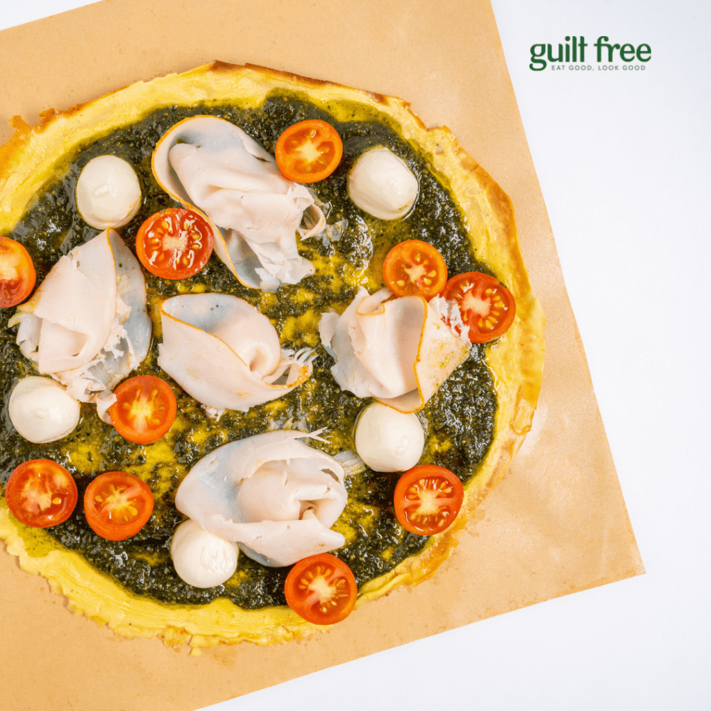 It is a low-calorie pizza with adequate protein, and the only ingredients used to make the incredible keto dough are whey protein and egg. It has no additional flour or sugar of any type and is topped with pesto, turkey ham, and burrata.