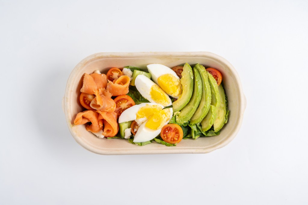 It has a protein-rich combination of egg, cucumber, cherry tomato, pickled red cabbage, goat cheese, avocado, and arugula. The avocado adds healthy fats and fiber, and the salmon offers heart-healthy omega-3 fatty acids.